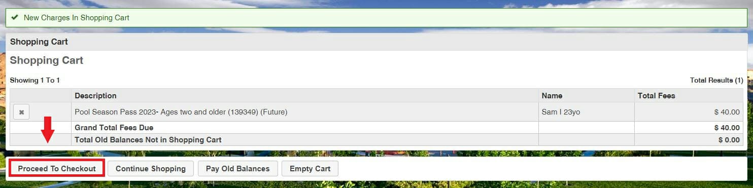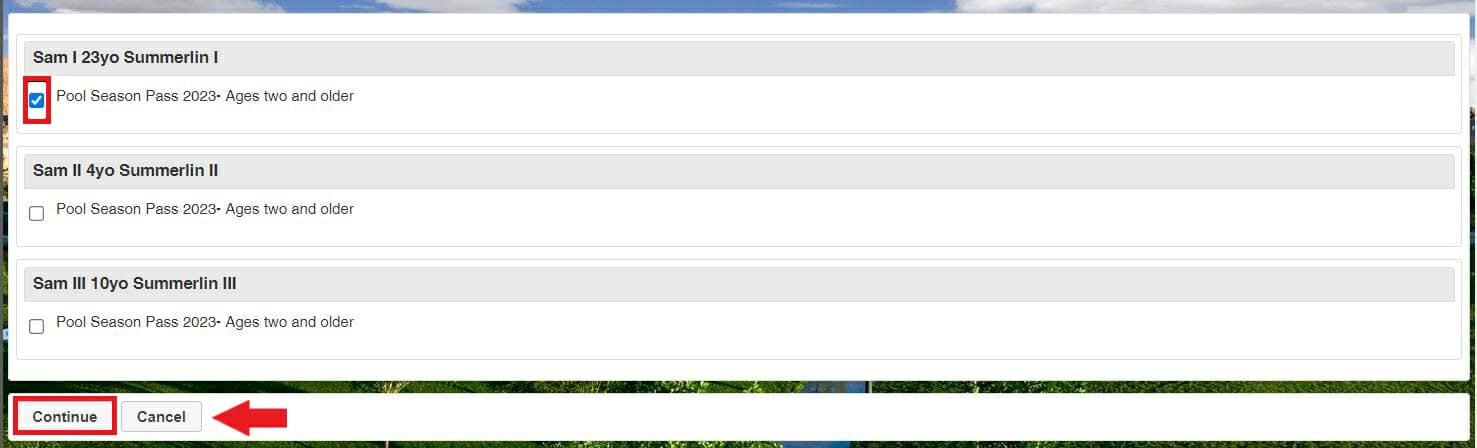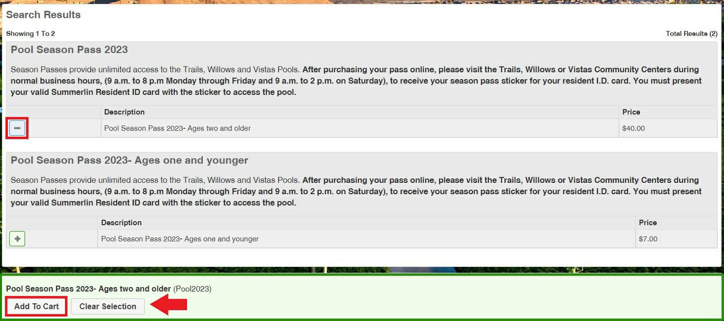 On this screen, you will find available pool passes based on age. Locate the pass you wish to purchase.