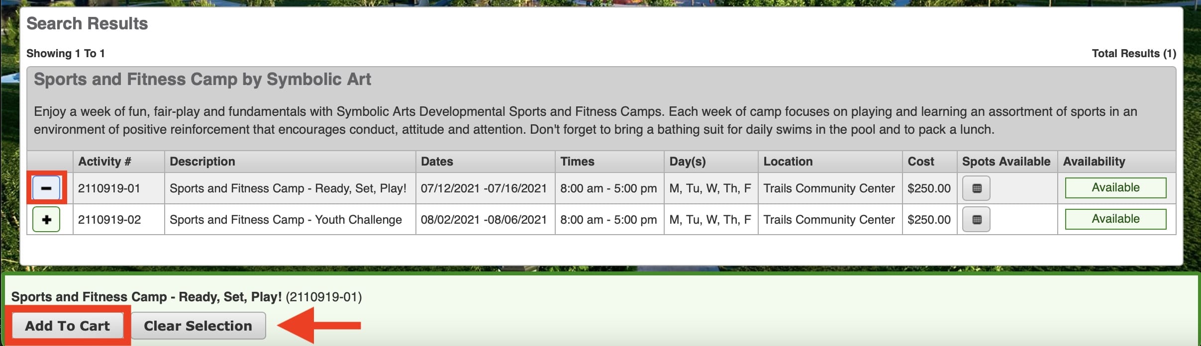 - When you locate the camp you are interested in purchasing, please click on the “+” sign at the left. If selected properly, it will change into a “-” indicating the activity has been selected.