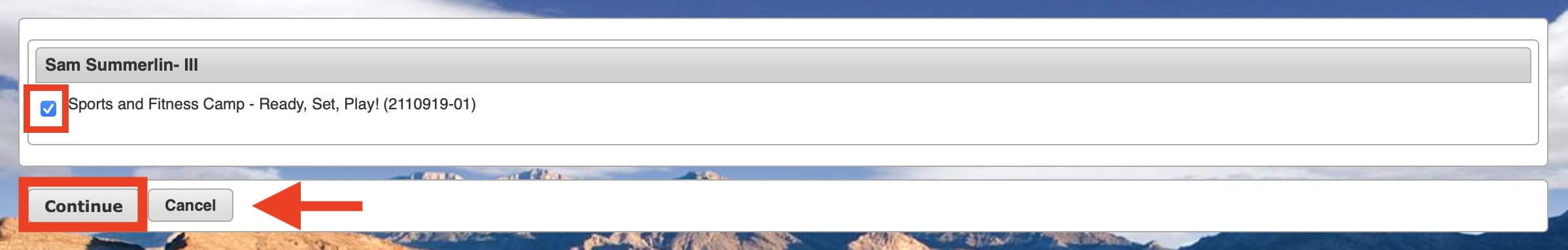 On this screen you will see the Sports and Fitness Camps available. Locate the camp you want to register for.
