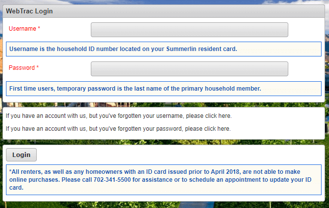 *To login into the WebTrac system, you must have an active Summerlin resident ID card issued as of April 2018 and Email address on file. (Renter ID cards are active for one year from date of issue.) If you don’t have an active ID card and/or Email on file with us, or if our data fails to match your responses, please contact The Summerlin Council at (702) 341-5500 during business hours for assistance.
