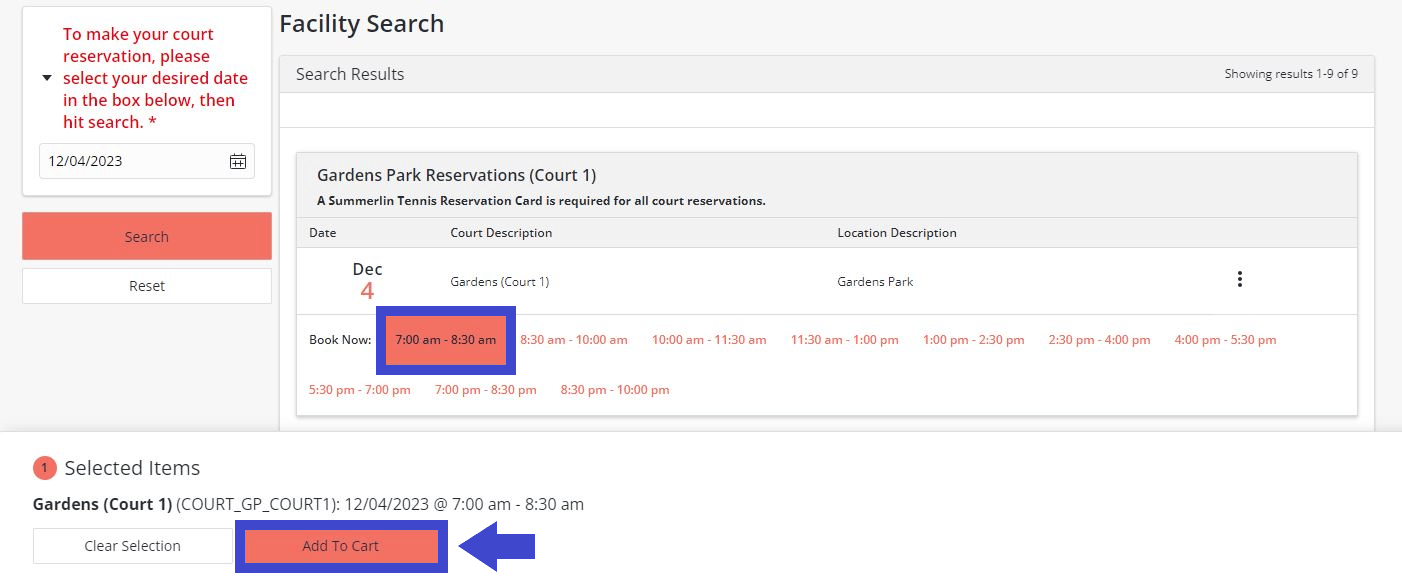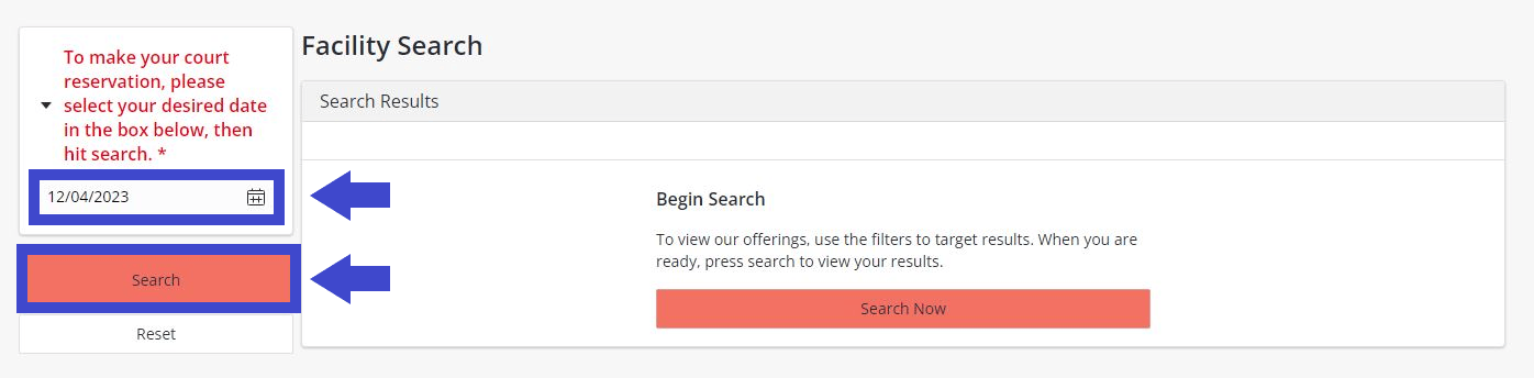 - Select the desired date you would like to make a tennis court reservation, then hit search.