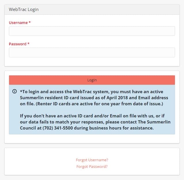 *To login into the WebTrac system, you must have an active Summerlin resident ID card issued as of April 2018 and Email address on file. (Renter ID cards are active for one year from date of issue.) If you don’t have an active ID card and/or Email on file with us, or if our data fails to match your responses, please contact The Summerlin Council at (702) 341-5500 during business hours for assistance.