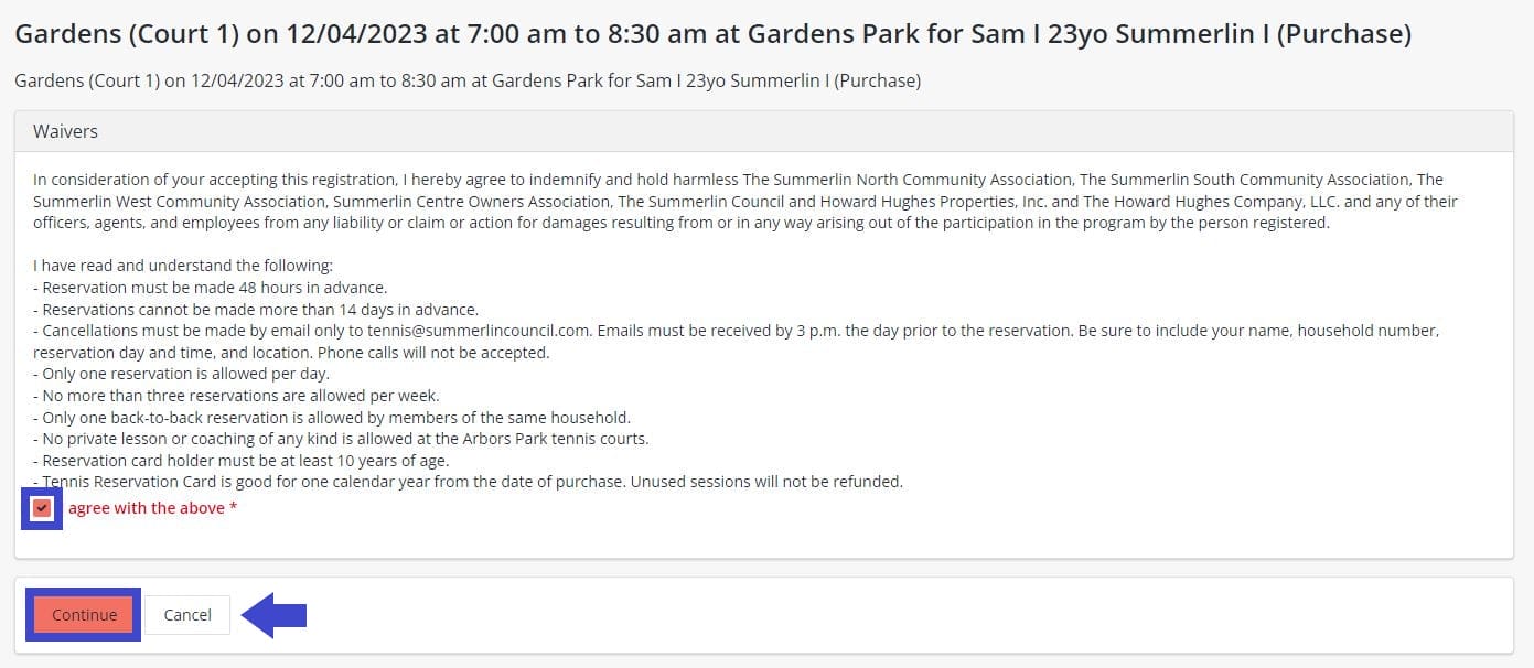 - If you do not want the tennis court reservation and wish to make a new selection, choose “Empty Cart” and start over.