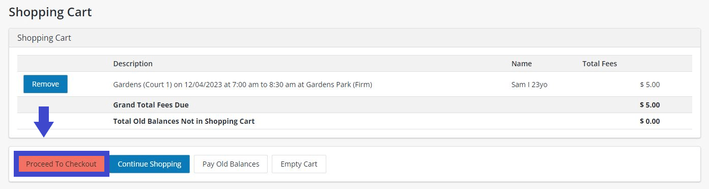 This screen will show the location, date, and time of the court reservation. If the selection is correct, click “Proceed to Checkout.”