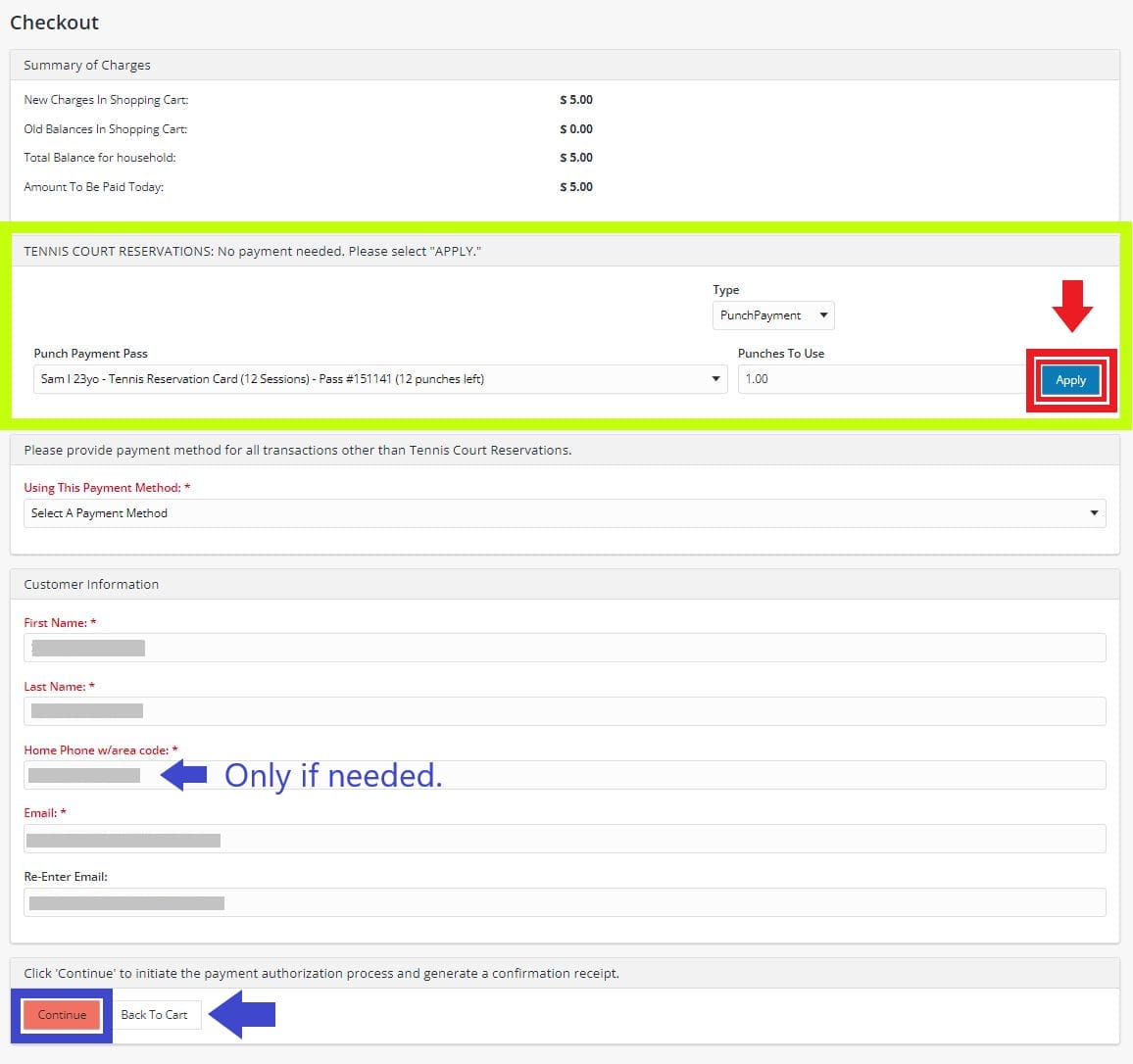 - Select “Apply.” A visit will be deducted from your Tennis Reservation Card.